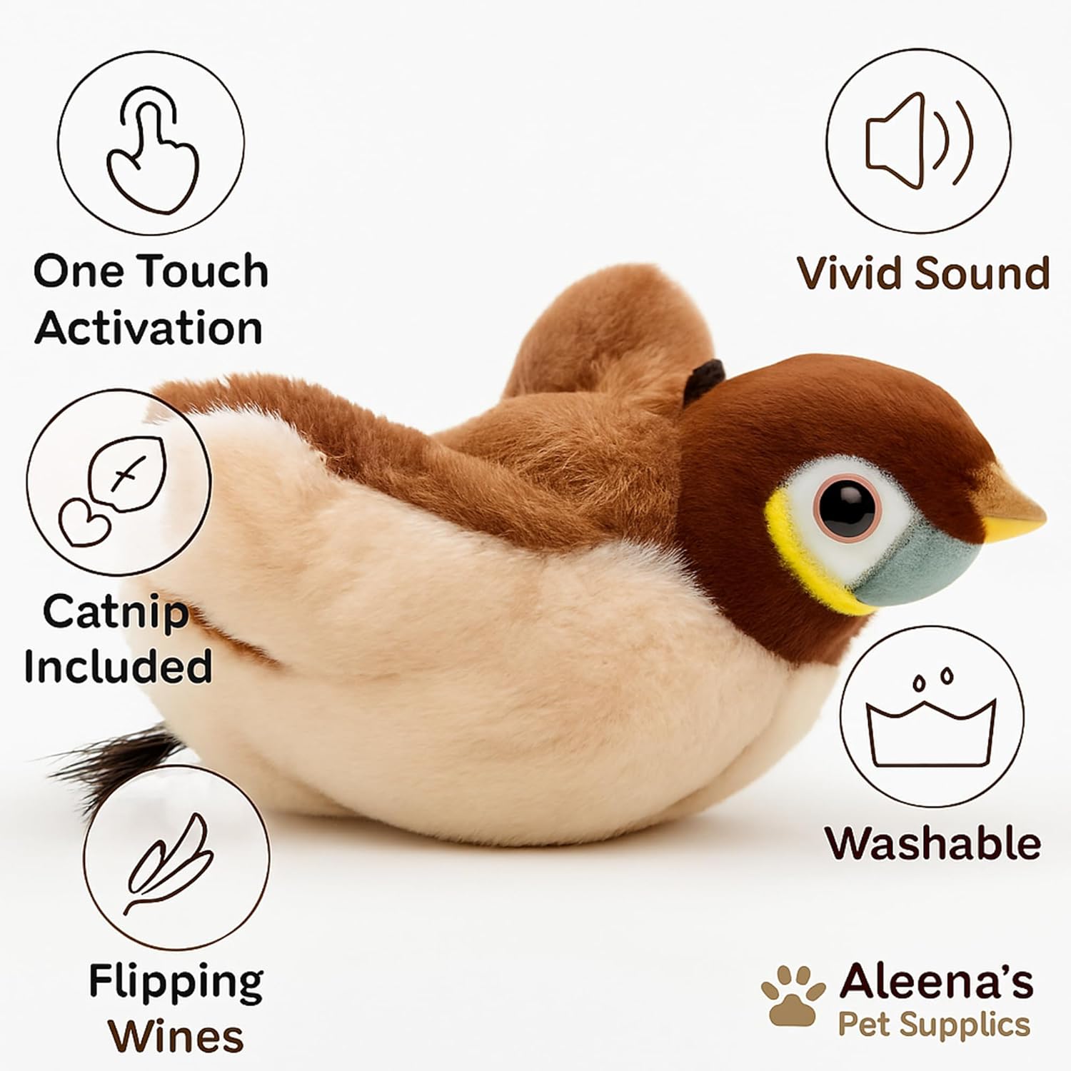 This interactive toy features lifelike flapping movements and chirping sounds that mimic real prey. It's designed for indoor cats, ensuring a stimulating play experience while emphasizing safety and durability, with no flying unpredictability to worry about.